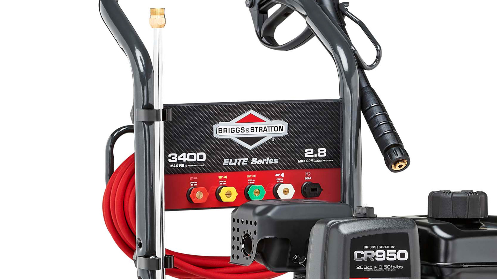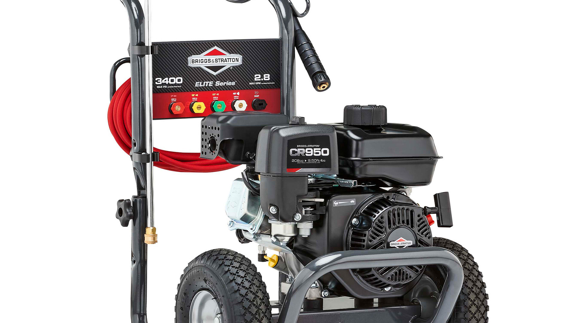 From oil stains and paint prep to delicate cleaning of your patio furniture, tackle a variety of outdoor cleaning jobs faster with the Briggs & Stratton® 3400 Max PSI pressure washer. This pressure washer combines a powerful Briggs & Stratton® CR950 OHV engine with an easy-starting axial cam pump to give you more cleaning power and performance. The 5 nozzles (0°, 15°, 25°, 40° and Soap) allow for versatility in your cleaning tasks.